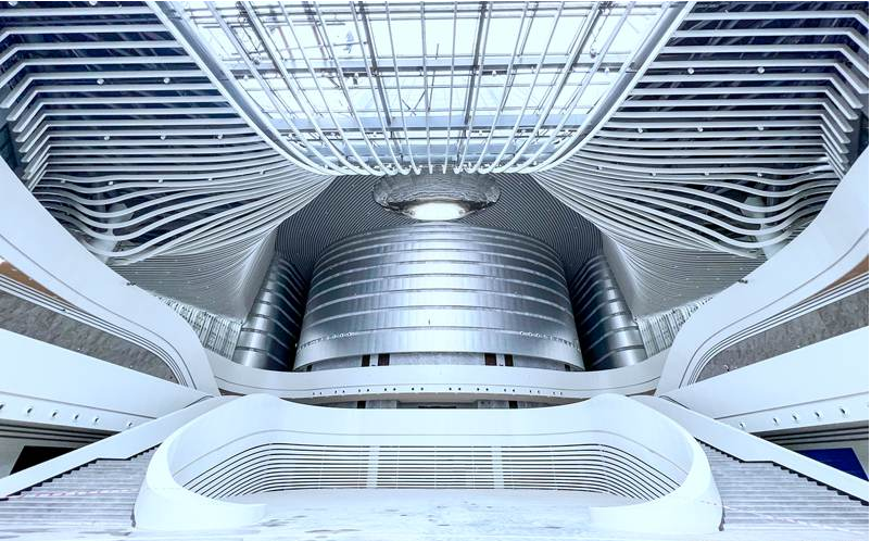 “两中心”大堂线条明朗,中央上方的“虫洞”设计能够让阳光自然洒进建筑内部。